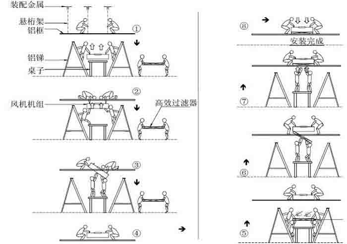 FFU安裝步驟二.兩位工作人員扶著鋁梯,把FFU風(fēng)機(jī)機(jī)組抬上天花板去,F(xiàn)FU風(fēng)機(jī)在搬運(yùn)過(guò)程中,應(yīng)始終處于水平狀態(tài),由在天花板的兩位安裝人員接應(yīng)。