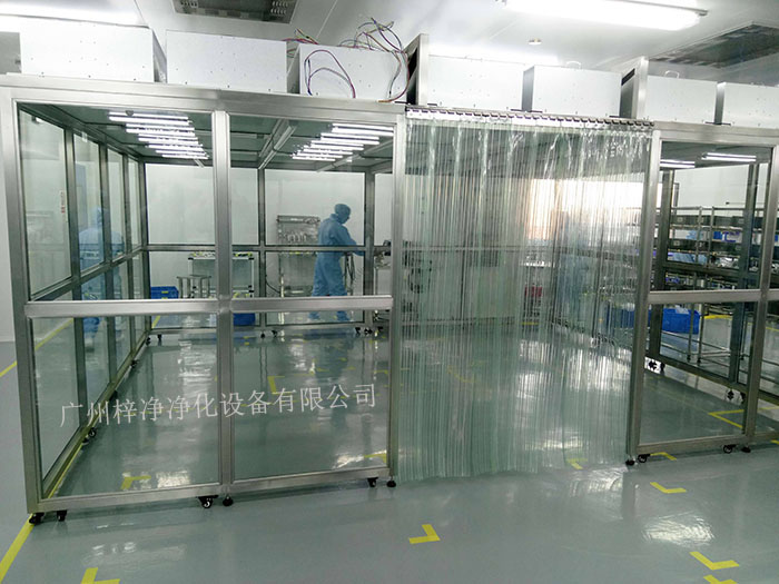 潔凈棚它主要從FFU頂部將空氣吸入,經(jīng)初效過濾器,高效過濾器過濾,過濾后的潔凈空氣在整個出風面以0.45m/s±20%的風速勻速送出到潔凈棚內。形成均流層,使?jié)崈艨諝鈿饬鞒蚀怪眴蜗蛄?,從而保證了工作區(qū)內所要求的潔凈度。潔凈棚等級通常分為百級潔凈棚,千級潔凈棚,萬級潔凈棚。