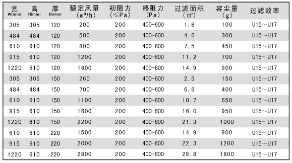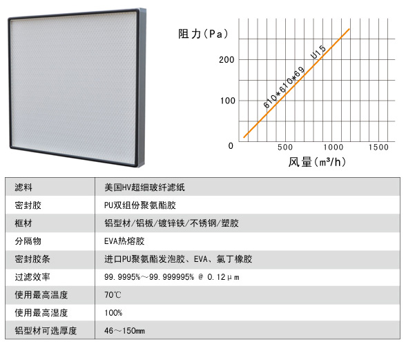 過(guò)濾效率:99.9995%-99.999995%(U15、U16) MPPS